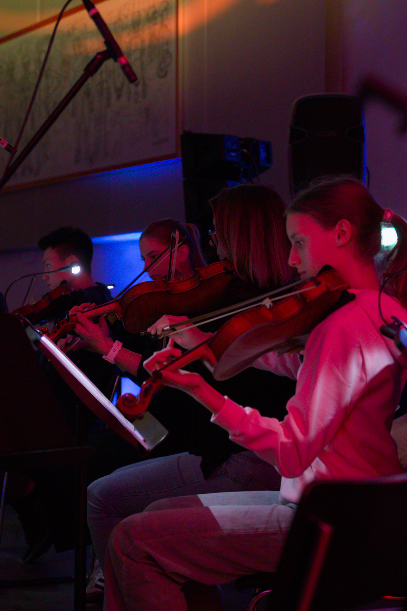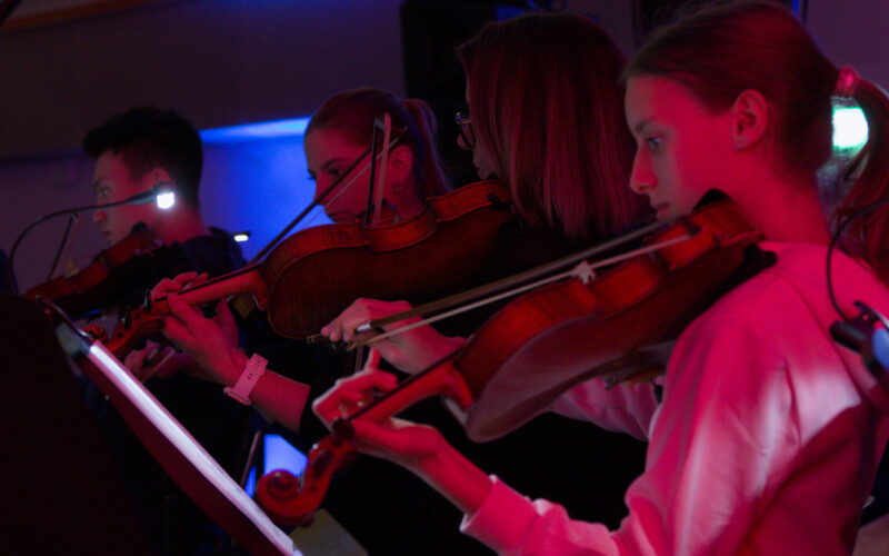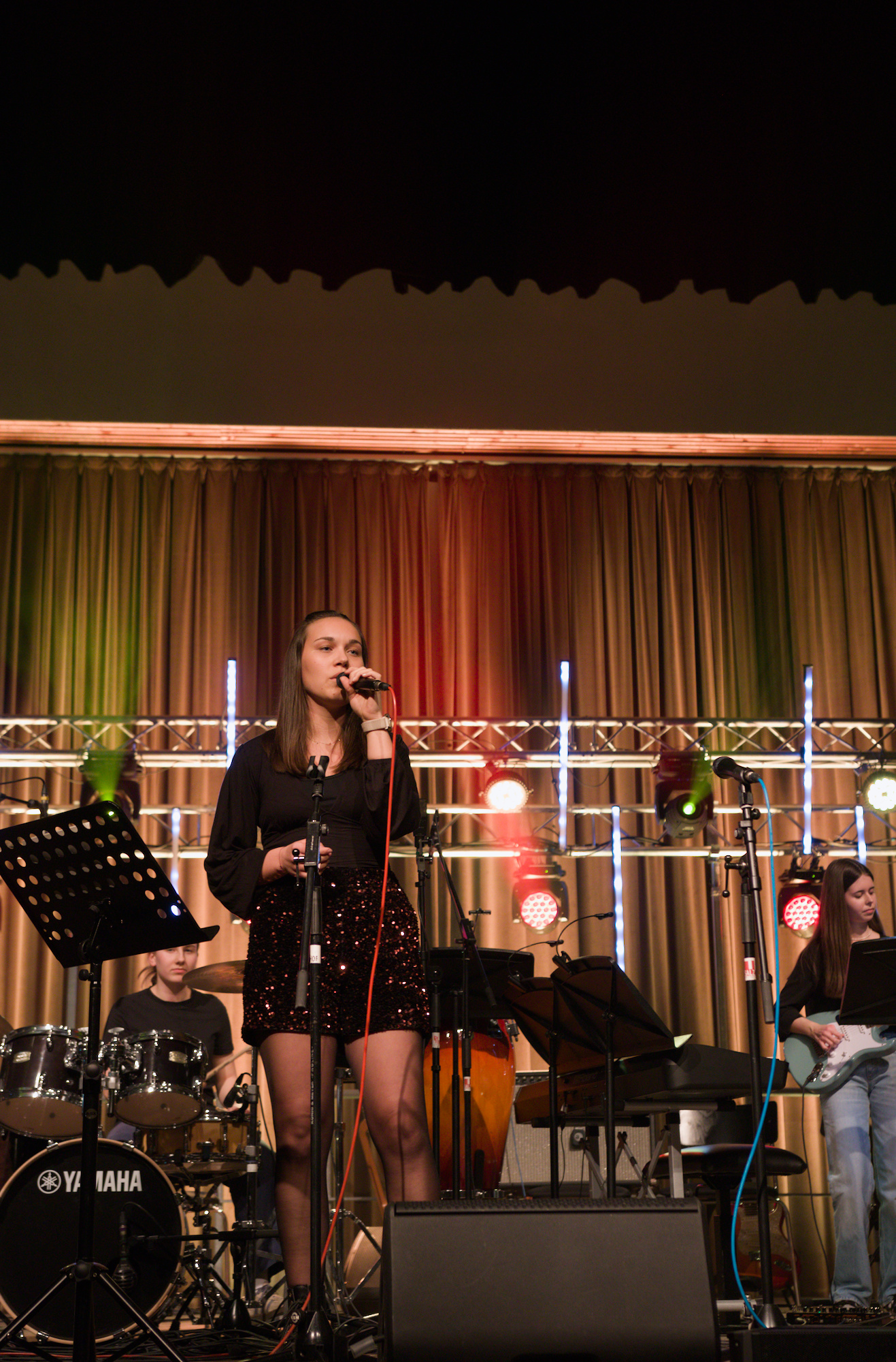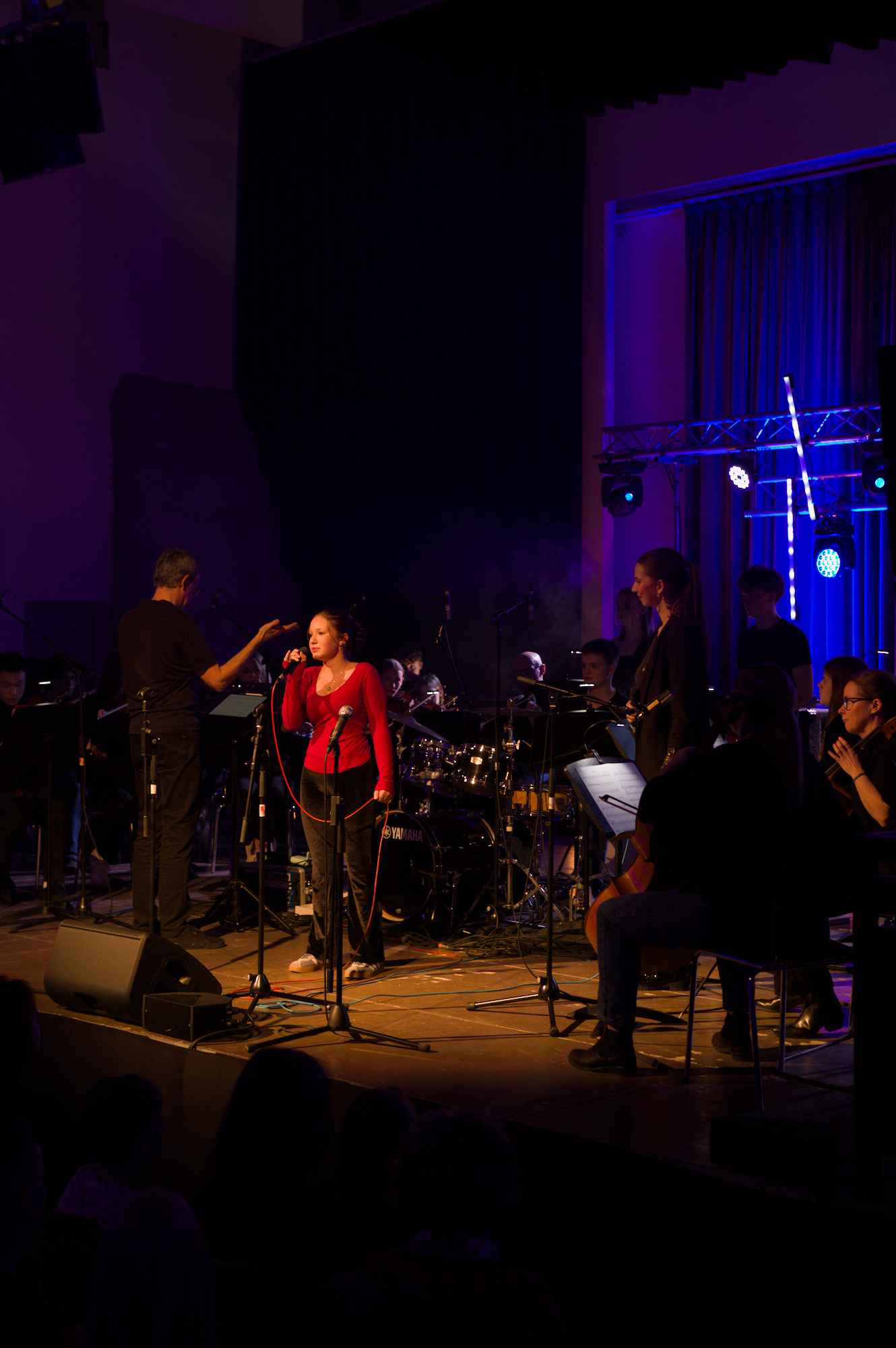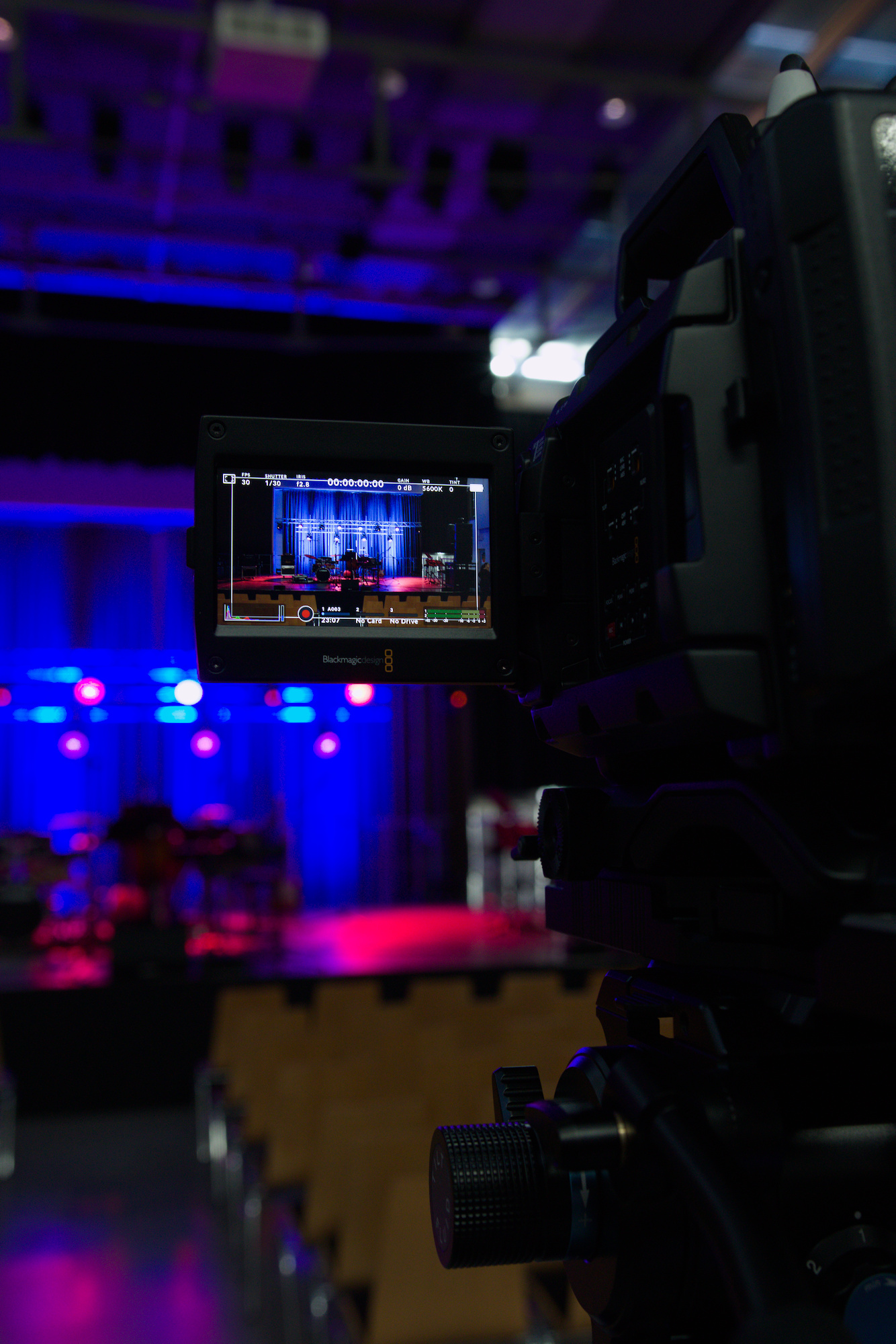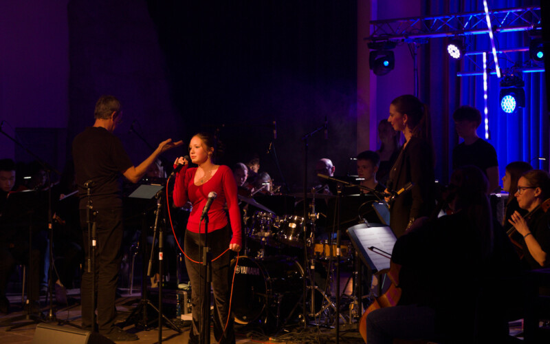 - Videotechnik (Video): Realisierung einer professionellen Videoaufzeichnung des gesamten Konzerts. Dies umfasste ein Setup zur optimalen Erfassung der großen Bühnenbesetzung, um sowohl die Solo-Performances der Bandmitglieder als auch die Ensembleleistung der Streicher für das Archiv und die Schüler hochauflösend festzuhalten.